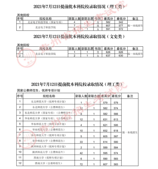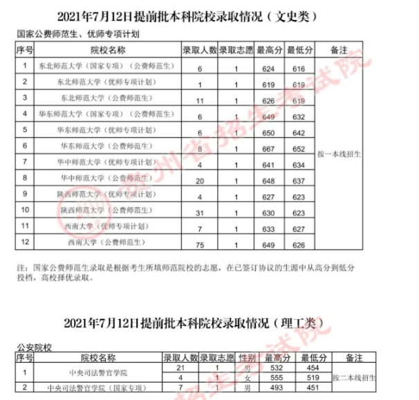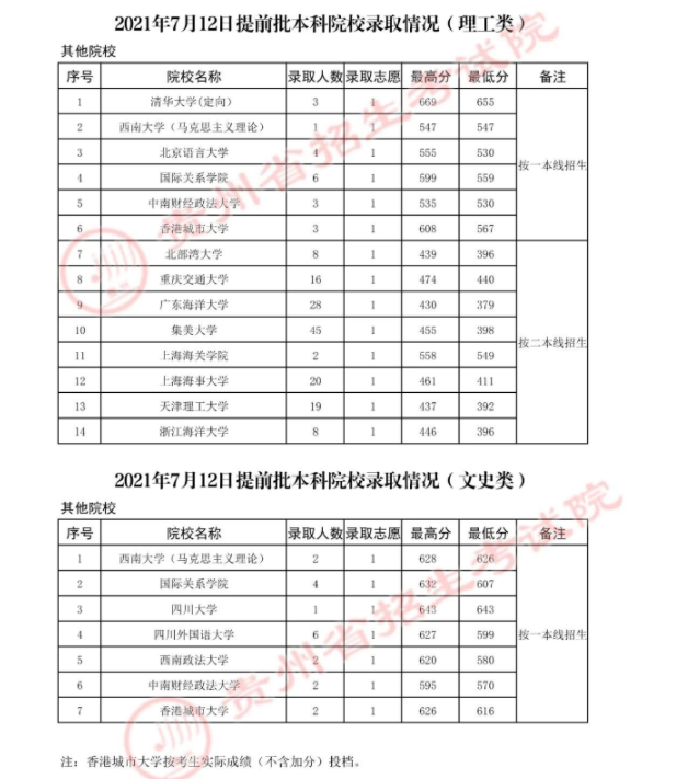 【导语】从贵州省招生考试院了解到,2021年7月12日贵州提前批本科院校录取情况已公布,为方便考生了解情况,现将提前批本科院校录取情况整理如下: