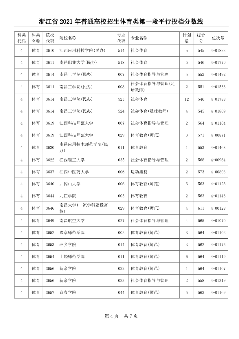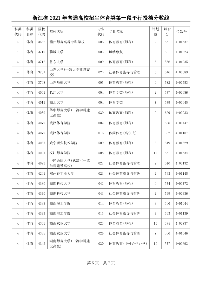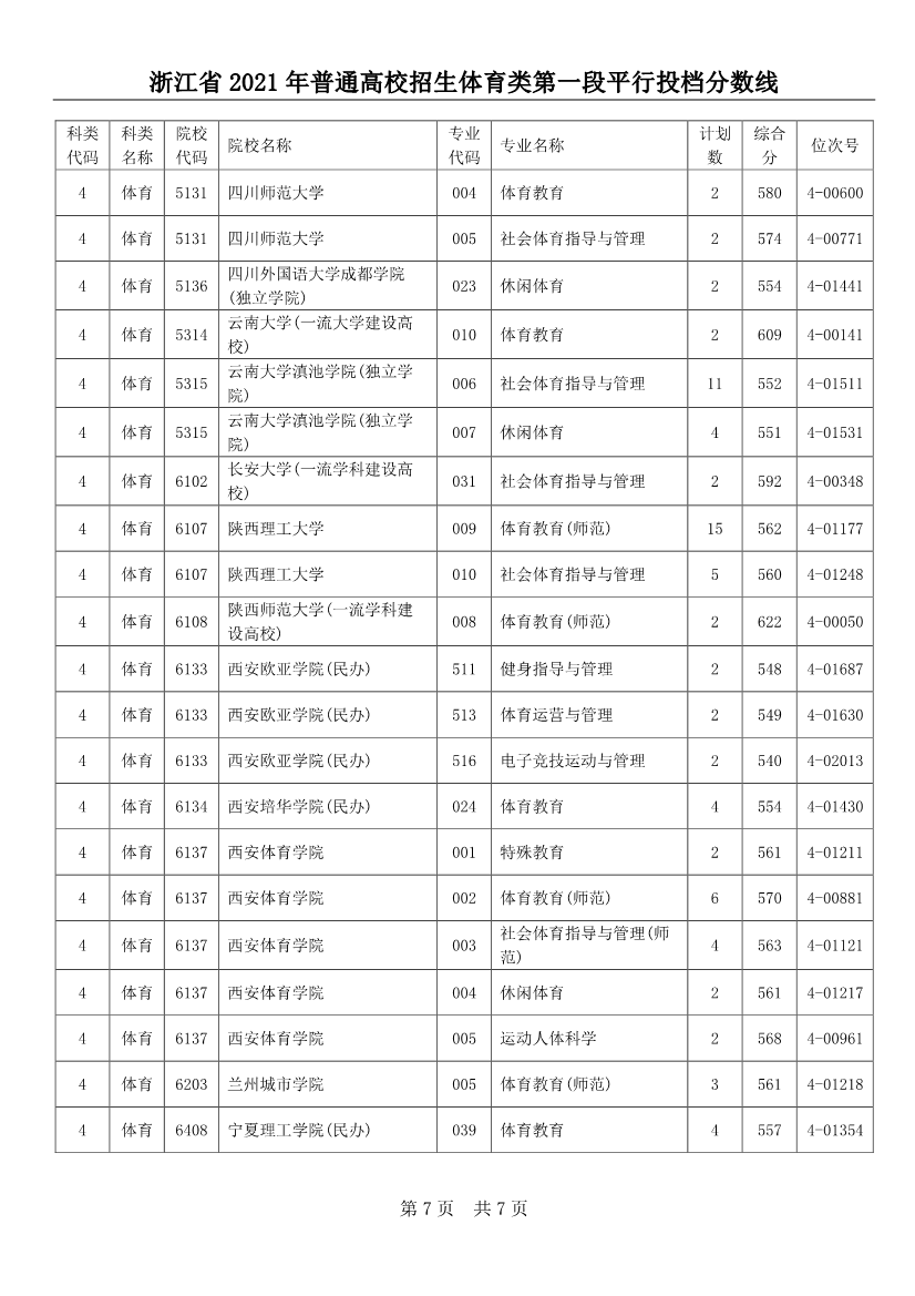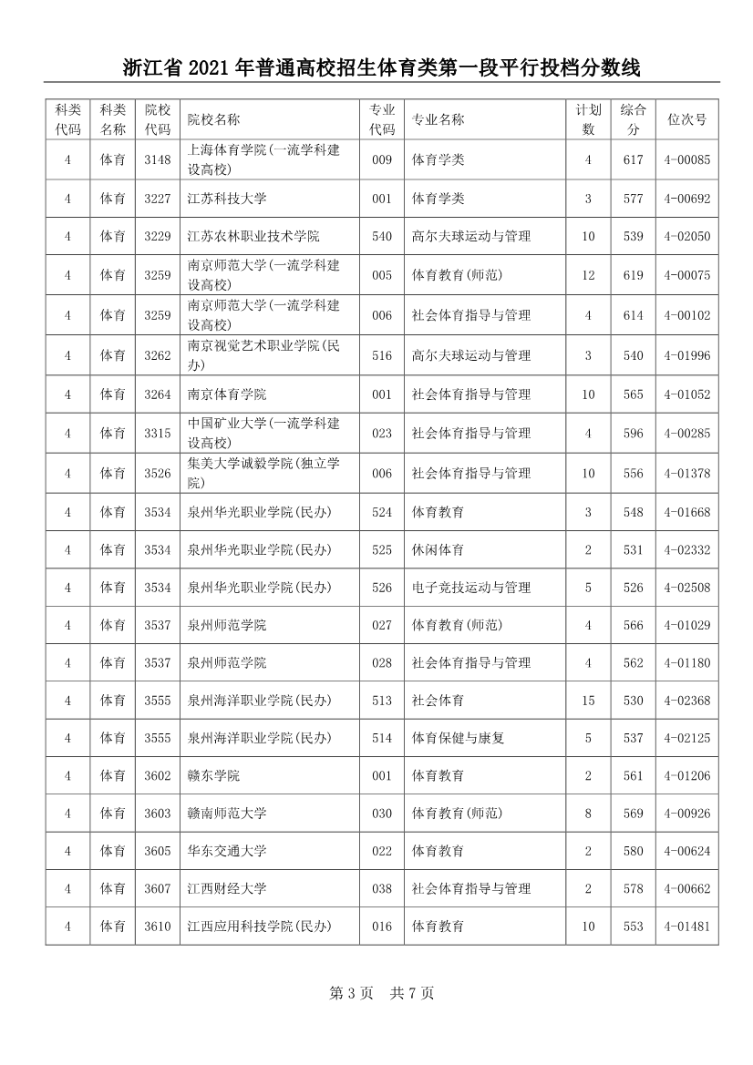 2021年浙江省普通高校招生体育类第一段平行投档分数线