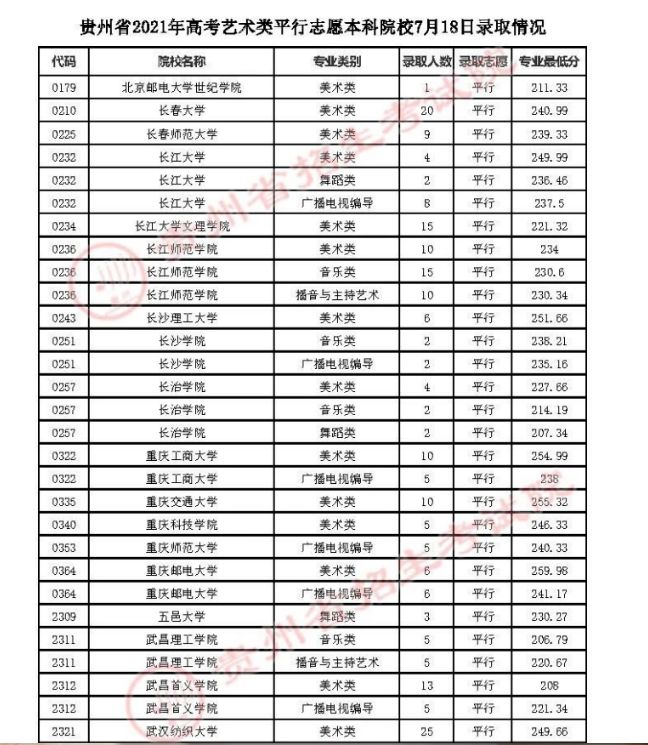 2021年7月18日贵州高考艺术类平行志愿本科院校录取情况