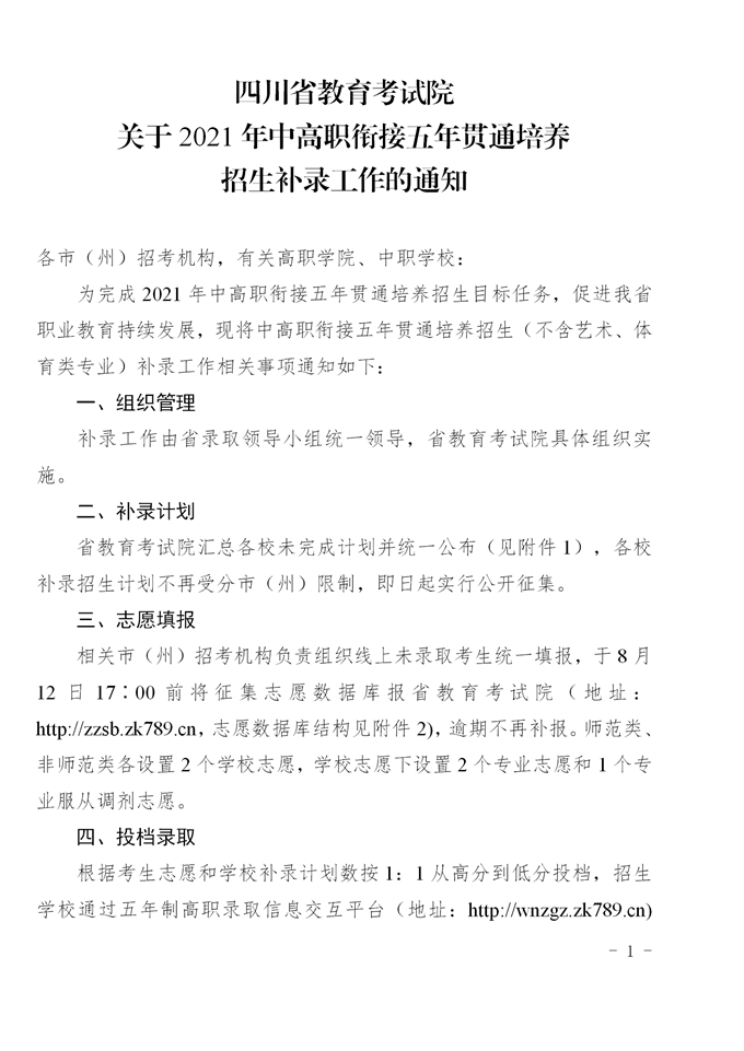 【导语】从四川省教育考试院了解到,2021年四川中高职衔接五年贯通培养招生补录工作的通知已发布,为方便考生了解情况,现将有关事宜通知如下: