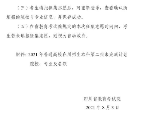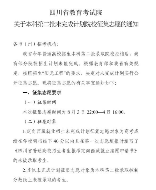 【导语】从四川省教育考试院了解到,关于本科第二批未完成计划院校征集志愿的通知已发布,为方便考生了解情况,现将有关事宜通知如下: