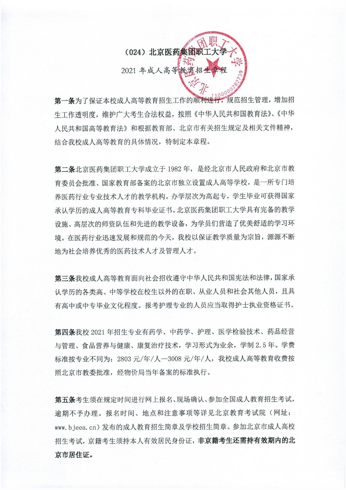 【导语】从北京教育考试院了解到,2021北京医药集团职工大学成人高等学校招生章程已发布,为方便考生报考,现将2021北京医药集团职工大学成人高等学校招生章程整理如下: