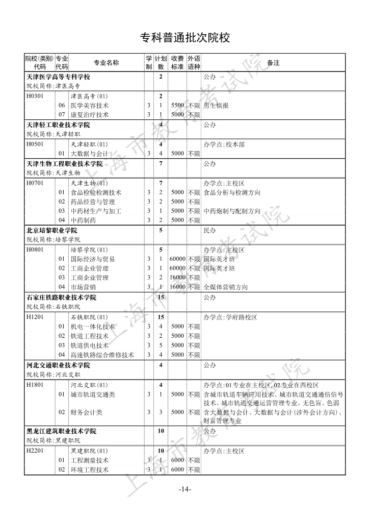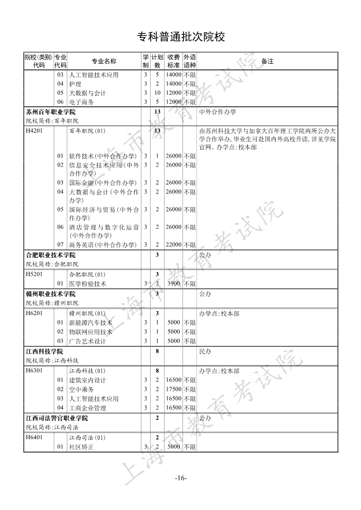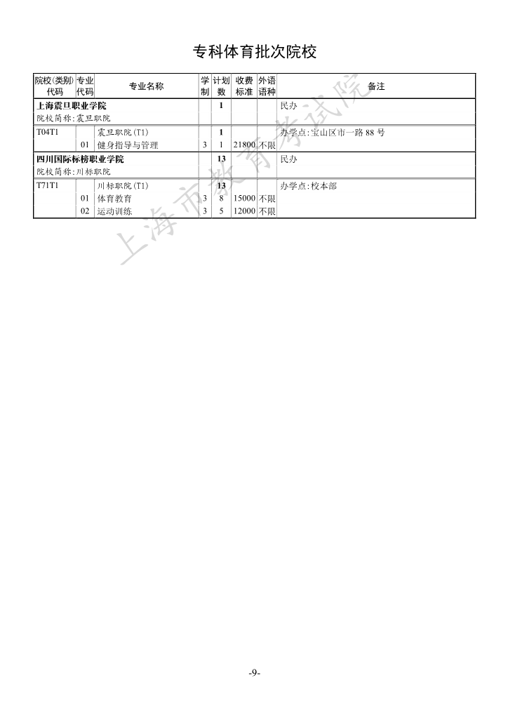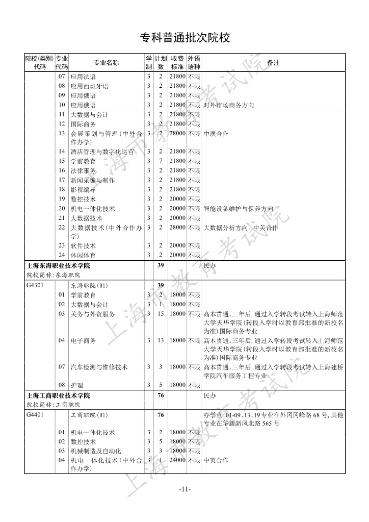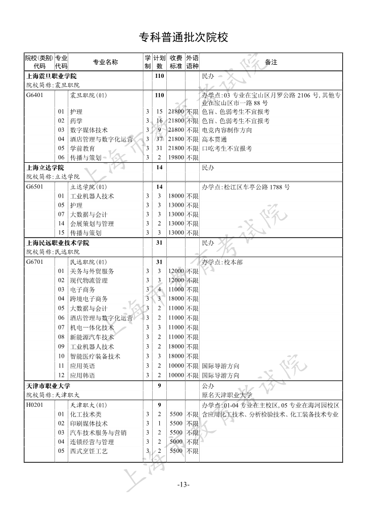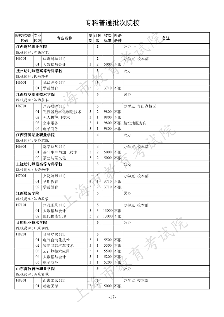 2021上海专科批次征求志愿填报院校(类别)缺额计划表